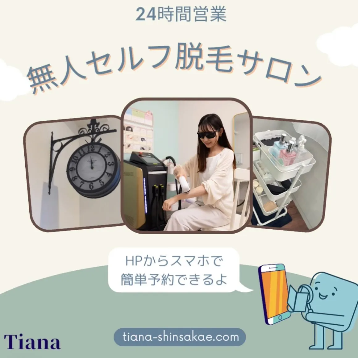 セルフ脱毛サロンTianaはスマホで簡単ご予約できる24時間営業⏰