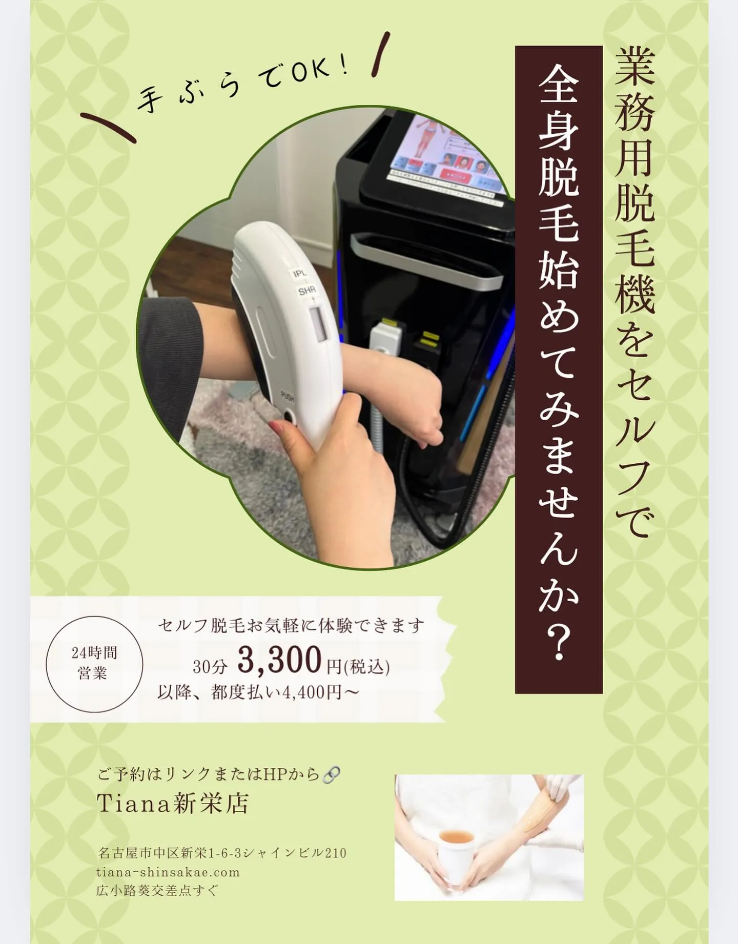 名古屋市中区、新栄エリアでセルフ脱毛サロンをお探しの方は、24時間営業でメンズも通えるTiana 名古屋新栄店がオススメです🏬✨