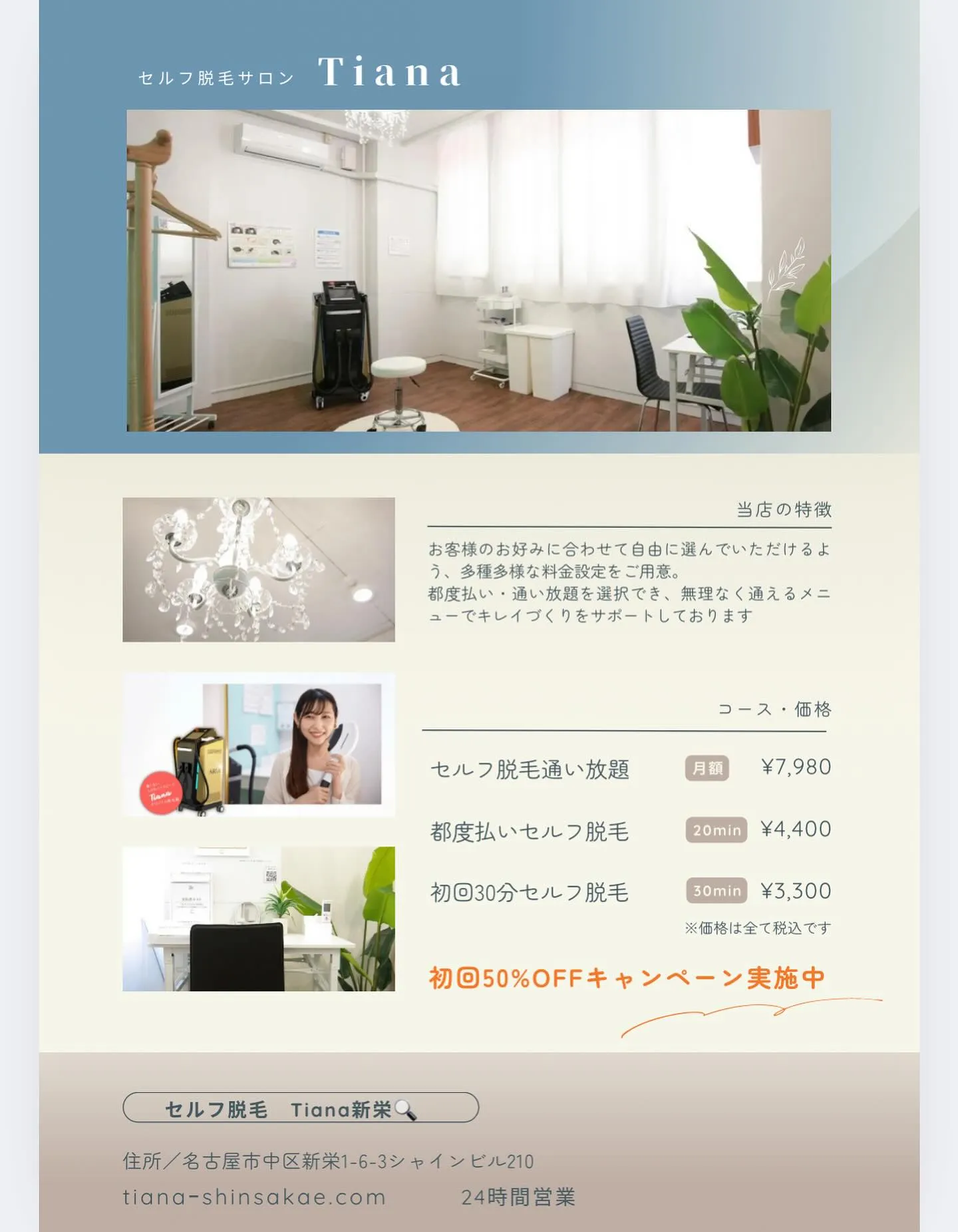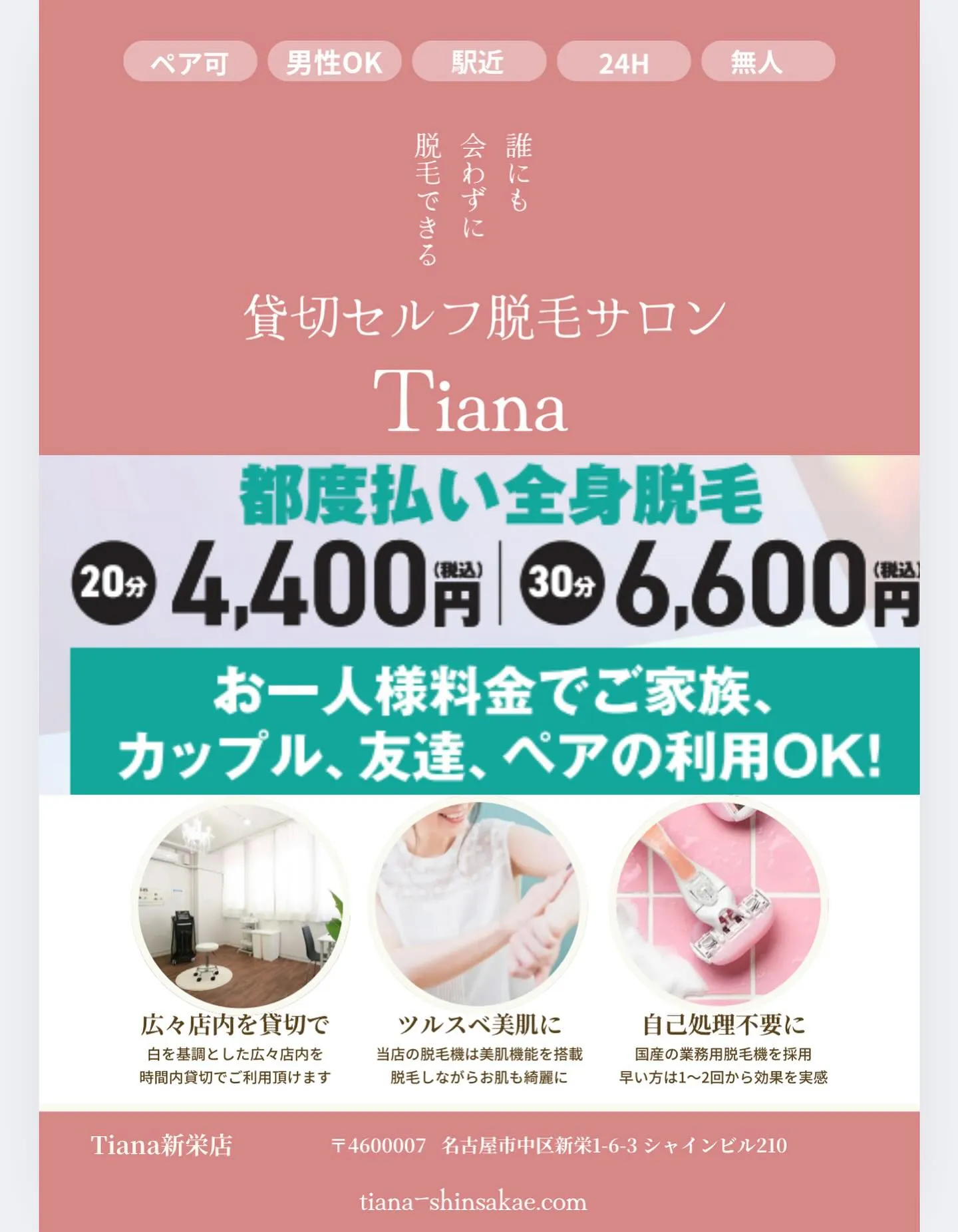 時間がない方も安心❕好きな時間に気になる箇所を👐スマホで簡単ご予約可能なサロン📱Tiana新栄店はセキュリティ万全の完全個室、鍵付貸切セルフ脱毛サロンです🏬国内製造の最高級業務用脱毛機を初回3,300円…